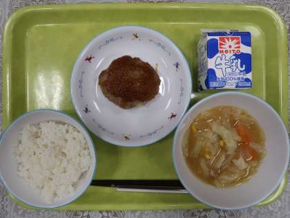 牛乳、七分づきごはん、おろしハンバーグ、どさんこ汁