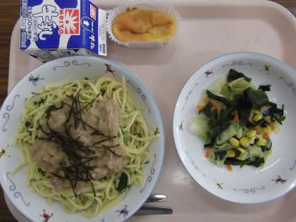 ご飯、魚のにんにくみそ焼き、さつまいもと大豆の甘辛揚げ、 みぞれ汁、牛乳 ※『みぞれ汁』ってなに? 大根おろしの入ったお吸い物やお味噌汁のこと。 大根のおろし汁の効能としては、ジアスターゼによる「整腸効果」 があり、胃の中に入ってきた食物を消化し吸収しやすくしてくれ ます。また、ビタミンCが含まれており、免疫力アップや活性酵素 を減らす、さらにはストレ スの緩和や肝機能を高めるといった効能 があるといわれています。 面接練習