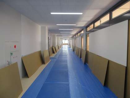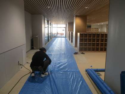 12月8日(月)、新校舎へ購入した備品の搬入が始まりました。まずは養生シートなどを通路に設置し、校舎に傷が付かないよう、保護対策を取ることから始まっています。