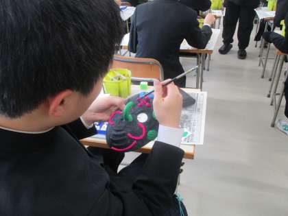 12月11日(木)、3年生の美術の授業では『仮面』作りが行われていました。素敵な仮面が数多くあり、生徒たちの力作が廊下に飾られています。