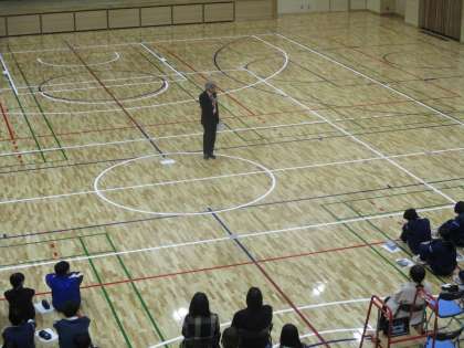 11月27日(木)、28日(金)の連日、旭丘中学校の体育館にて、豊玉第二小学校のコスモス学級と旭丘小学校のあさひ学級の児童で交流授業を行いました。D組生徒から自己紹介、スライドを使った中学校生活の紹介をおこない、児童からの質問も受けていました。そして体育の授業では小中混合チームで『ボッチャ』に挑戦し、上級生としての自覚をもって取り組んでいる姿勢が非常に印象的でした。