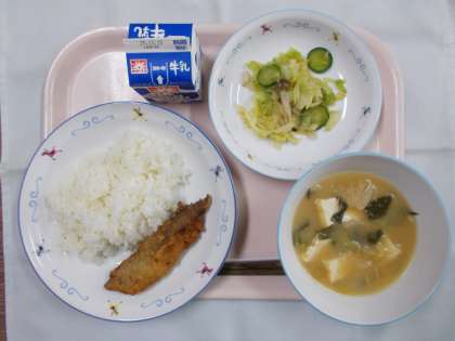 ・魚の竜田揚げ ・生揚げと白菜の味噌汁 ・キャベツのだし浸し ・牛乳 12月2日(火)給食