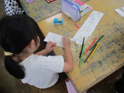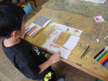自分で考えたお話を数枚にわたって描き、それをつなげたり、絵本の形にしたりして完成させていきます。お話を考えながら描いている表情がとても楽しそうで、次から次へとアイデアが湧き出ていました。