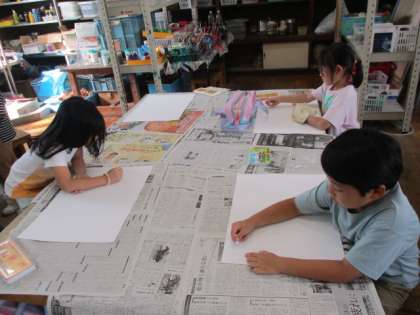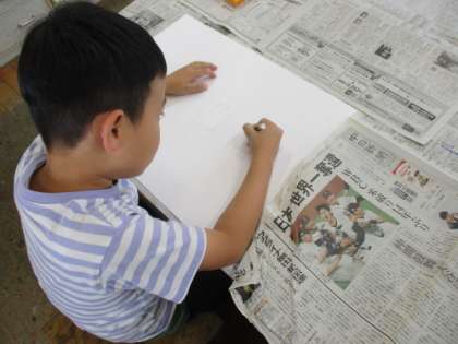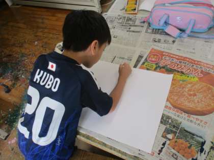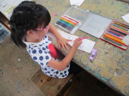白い画用紙に白いクレパスで、不思議な生き物を想像して描き、その上を絵具で色を塗って完成する「はじき絵」に取り組んでいます。自分で描いた不思議な生き物が、絵具を塗るとどのように浮かんでくるのか、今から楽しみです。(画像では見えずらいですが、白画用紙にはしっかりと白クレパスの線が描かれています!)