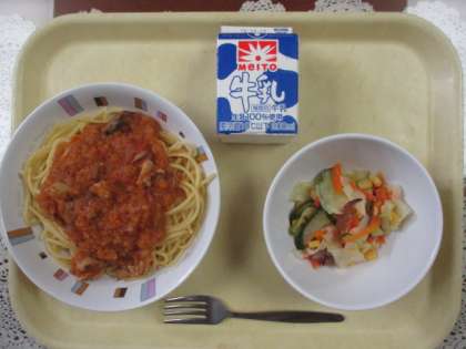 牛乳、スパゲティあけぼのソース、カリカリベーコンのサラダ