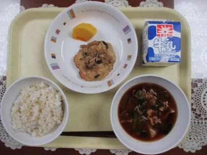 牛乳、発芽玄米ご飯、ビーンズバーグきのこあんかけ、豚じゃがみそ汁、くだもの