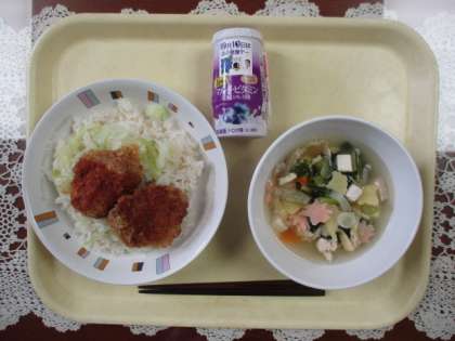 ジョア(マスカット)ご飯、ソースカツ、ゆでキャベツ、すまし汁