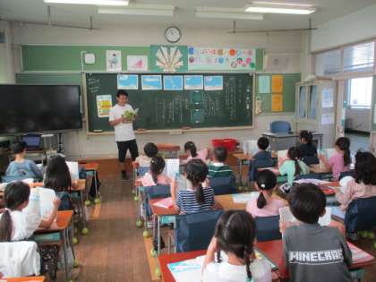 3年生から始まる外国語活動に向けて、2年生では年間を通して数回ALTと一緒に英語に親しむ学習を行っています。
