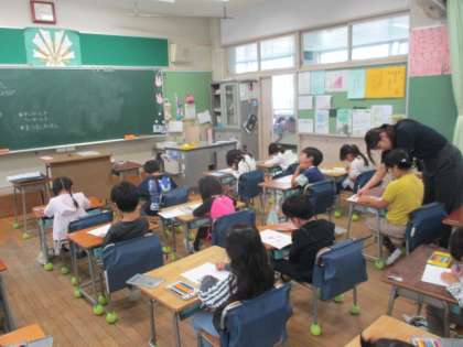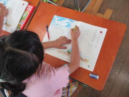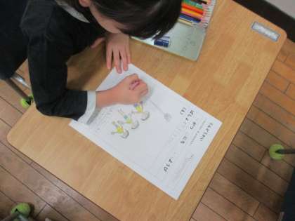 単元「くじらぐも」に取り組んでおり、本文にあるかぎかっこの中の言葉は誰が言ったのかを考え、教科書に色別に線を引いていました。かぎかっこの前後の文から読み取って考えることを頑張っていました。