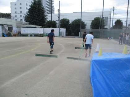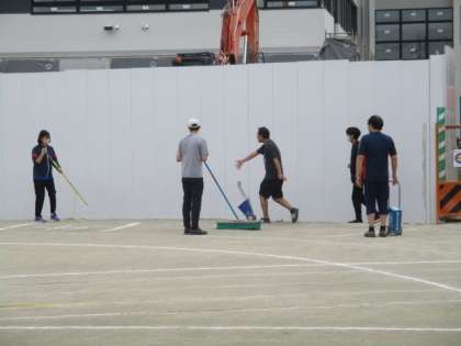 高学年が準備をしてくれたあとは、先生たちで準備です。ブラシをかけて整備したり、新しくラインを引き直したりと、子供たちがよりよく活躍できるようにしっかり準備しています。当日の天候が気になるところではありますが、無事に実施できることを祈るばかりです。