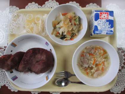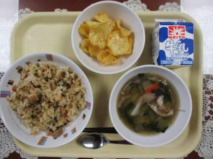 牛乳、豚バラ高菜ご飯、白玉汁、さつま芋のフラワー揚げ