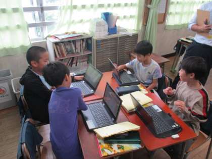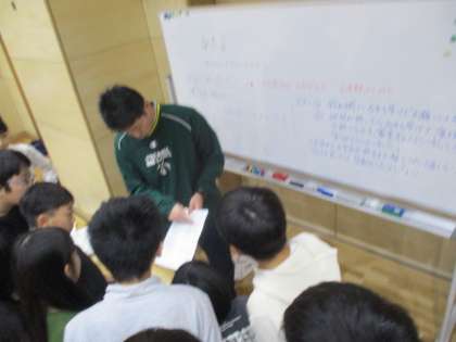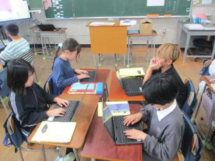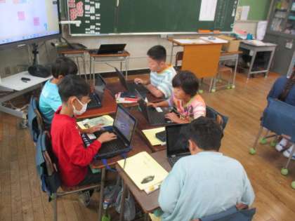 単元「ごんぎつね」に取り組んでおり、学習したことを基にして、みんなで考えた疑問をタブレットパソコンを使いながら話し合いました。話し合いを進める中、考えた疑問についてより深めようと意見を交流していました。