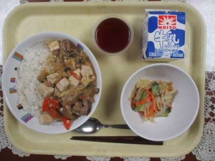 牛乳、豆腐あんかけ丼、みそドレッシングサラダ、紅茶ゼリー