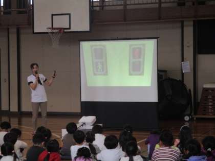 1年生は、日本交通安全教育普及協会の方をお招きし、交通安全について大切なことを教えてもらいました。青信号がチカチカしているときにどうするのか、道路の渡り方、どうして手をあげて渡るのかなど教えてもらい、「アイコンタクト」の大切さをしっかり学ぶことができました。