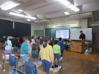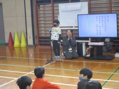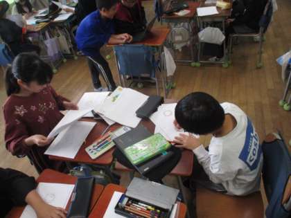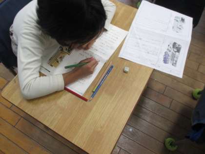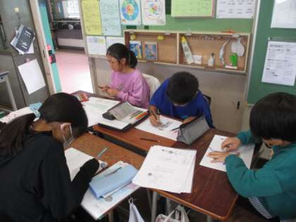 生活科で育てていたアサガオの枯れたつるを使って、リースづくりを行いました。自分の鉢のアサガオのつるを根元から切り取り、図工室で丸く型どってから飾り付けをしていきます。どんなリースが出来上がるか、楽しみですね。 小学校英語4技能検定(6年生)