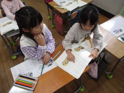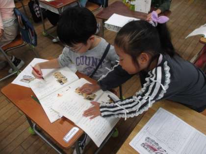 学校の近くにあるお寺の参道に伺い、秋見つけをしました。どんぐりや落ち葉など、秋の季節を感じられるものをたくさん拾っていた子供たち。「かわいいどんぐり見つけたよ!」「たくさん集められた!」「きれいな色のどんぐり!」とたくさんの秋を見つけられたようです。 話をつないでいこう(2年生)