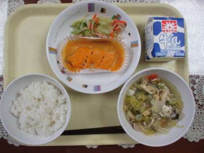 音楽会に向けた合唱と合奏の練習をしていました。特に合奏では、音を伸ばすのではなく切ることや、指揮のタイミングに合わせて音を出すことなど、ポイントとなるところを意識できるように頑張って取り組んでいました。今まではクラスごとの練習でしたが、来週からは学年での全体練習が始まります。 11月5日(水)の給食