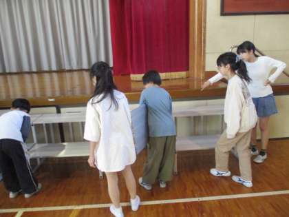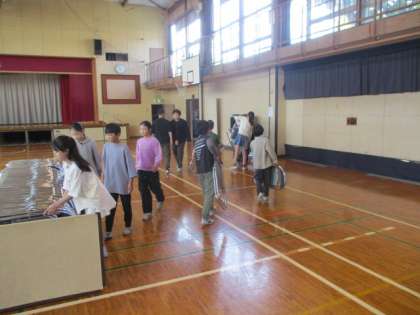 5年生の仕事はフロアーにある跳び箱やマットの片付け、観覧席の準備、ひな壇の設置などです。どの子も積極的に準備に関わる姿勢がとても素晴らしかったです。 11月7日(金)の給食