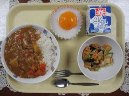 短なわを使って、様々な跳び方に挑戦していました。継続的に跳ぶことで体力面の向上にもつながり、様々な技に挑戦することで多様な動きを身に付けることにもなります。短なわ月間でもあるので、子供たちの意欲は更に高まっています。 11月17日(月)の給食