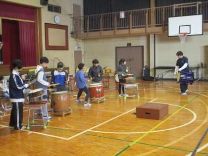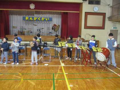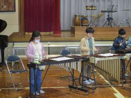 ボール運動のベースボール型として、ティーボールを行っています。攻撃側はティーに置かれたボールを打ったら走り、守備側は打ったボールを取ったら決められた陣地にみんなで入るといったルールで楽しく取り組んでいました。 音楽会に向けた練習(2年生)