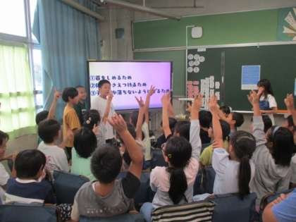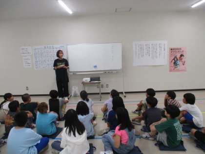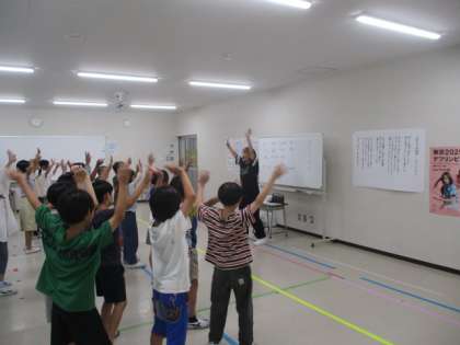手話にはどんなものがあるか、もし聞こえなかったり聞こえずらかったりする人がいたらどうしたらいいかなどの話を聞いたのち、指文字に取り組んだり手話ダンスをやってみたりしました。子供たちにとって、手話をより身近に感じることができたようでした。
