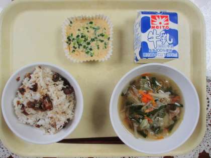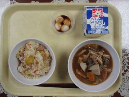 牛乳、豚バラ高菜ご飯、白玉汁、さつま芋のフラワー揚げ