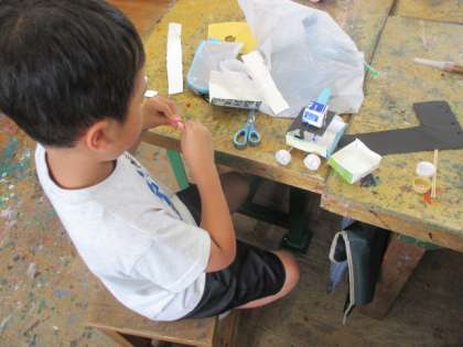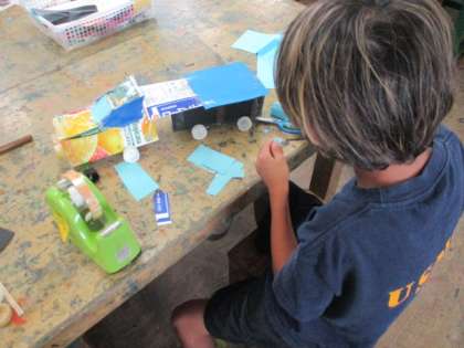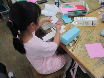 子供たちが持参した牛乳パックやペットボトルキャップを使い、動く仕掛けの工作をしています。創意工夫を凝らしながら工作を進め、完成した子たちは廊下で楽しそうに走らせていました。