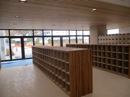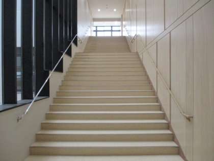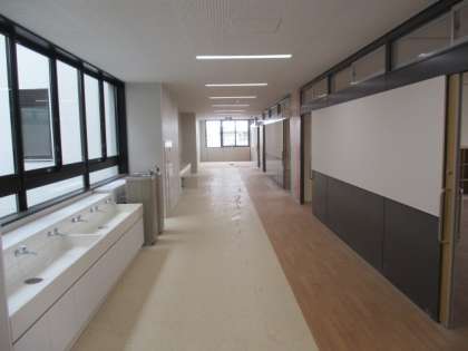 写真は上から、玄関の下駄箱、2階に上がる階段、廊下になります。来月からは新校舎での生活です。備品等もこれから随時搬入されていきます。 |