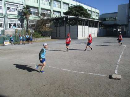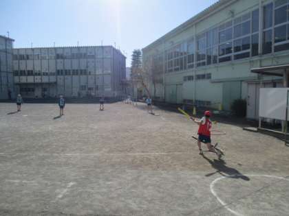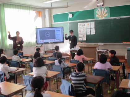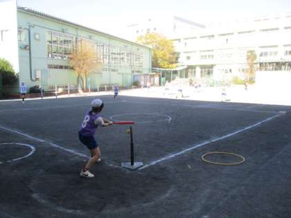 ベースボール型のボール運動として、ティーボールを行っています。バッティングの仕方をアドバイスしたり、守備の仕方を確認し合ったりと、お互いに声をかけ合うことで、より楽しく活動的なゲームとなっていました。 英語を楽しもう(1年生)