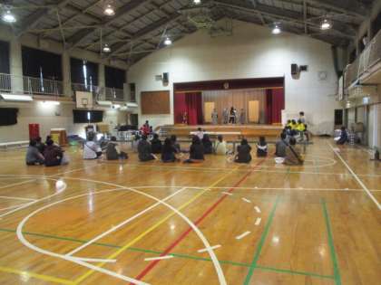 入浴後、ジュースを飲んでのんびりしています。夕食後には、4校合同で「キャンドルファイヤー」を行いました。