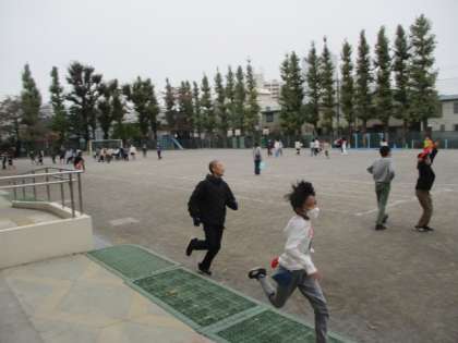 部屋の片づけ、掃除もします。 中庭で朝の会をしました。