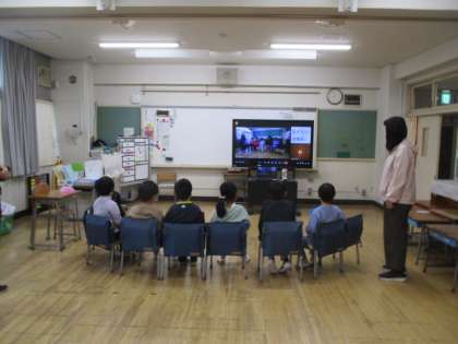 今朝はコスモス学級と通常級の交流時間、各学年で工夫して取り組みました。校庭でリボン取りゲームをしたり、オンラインでクイズを出したり、視聴覚室に集まって一緒に踊ったりして、交流時間を楽しみました。