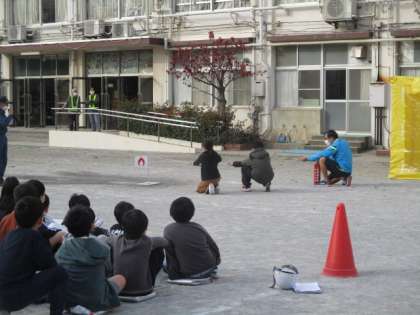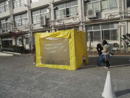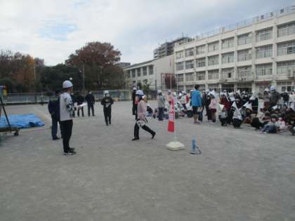その後、5年生が代表して、練馬消防署の方にご指導いただき、煙体験と一部消火器体験を行いました。日頃からハンカチ・ちり紙を身につけてほしいです。