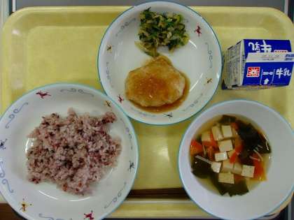 今日の給食 ・牛乳 ・黒米赤飯 ・和風塩麴ハンバーグ ・えのきのすまし汁 ・グリーンサラダ 今日は、中村小学校の芝生20周年のお祝いに、黒米を使った赤飯を出しました。黒米は古くから食べられてきたお米で、お祝い用としても使われていました。白米と混ぜて炊くと、ごはんがお赤飯のような色になります。 サラダは、芝生の緑色をイメージした「グリーンサラダ」です。キャベツ、きゅうり、ほうれんそうを使って作りました。 芝生20周年5