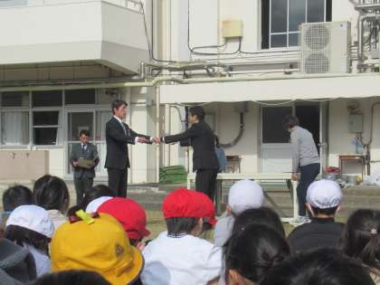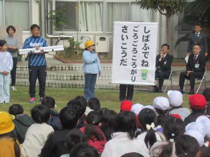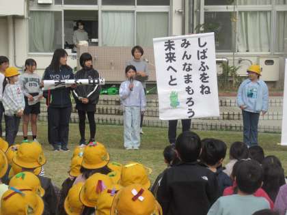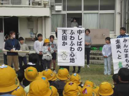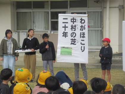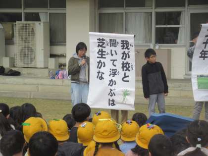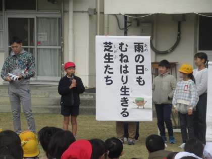 芝生20周年を記念して、子供たちが芝生の俳句を作りました。学年の代表作品の紹介がありました。 1年生「しばふでね ごろごろころがり さいこうだ」 2年生「しばふをね みんなまもろう 未来へと」 3年生「中しばの ふわふわ心地 天国か」 芝生への気持ちが伝わるすてきな作品ばかりです。