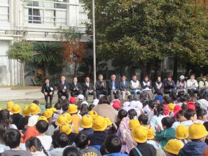 本校の卒業生で練馬区議会議員の小林みつぐ様をはじめ、練馬区教育委員会、芝生20周年実行委員会、中村小学校PTA、学校地域連携委員会、中村小グリーンキーパーズの方々にご来賓として集会に参加していただきました。