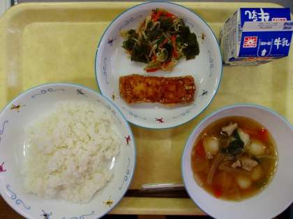 今日の給食 ・牛乳 ・ごはん ・かじきの竜田揚げ ・白玉汁 ・わかめサラダ 11月24日は「和食の日」です。「いいにほんしょく」ということにちなんで、この日になりました。和食は栄養バランスがよく、だしのうまみや、食材の持つ味を大切にして作られます。 「かじきの竜田揚げ」には、「めかじき」という魚を使っています。くせがなく、食べやすい魚で、冷めてもやわらかいといわれています。おいしく食べてくださいね。 11月20日(木)