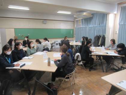 グループ協議の時間の様子です。参加者がグループを作って、本日の提案や授業について意見交換をしました。豊玉・開進地区の体育研究部員の方々は、この後の説明のために打合せです。