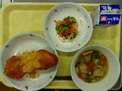 今日の給食 ・牛乳 ・きな粉揚げパン ・肉団子入り春雨スープ ・野菜のレモンじょうゆあえ 「きな粉揚げパン」は、給食の人気メニューです。パンにまぶしてあるのは、きな粉、砂糖、そしてほんの少しの塩です。塩を入れることで、砂糖の甘さが引き立ちます。 パンは、給食室の大きな釜で揚げます。外側はカリッと、内側はふわっとするように揚げることがポイントです。食感を楽しみながら食べてくださいね。 幼保小懇談会3