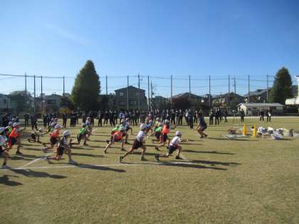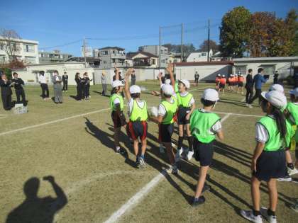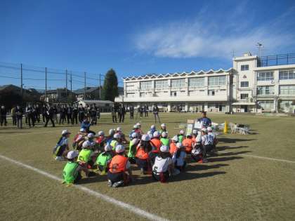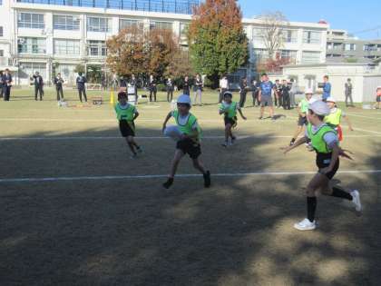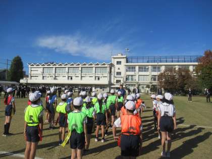 練馬区小学校教育会全体研究会(体育)が中村小学校で行われました。はじめに、体育研究部豊玉・開進地区が積み重ねてきた研究の実証授業が行われました。本校4年生の体育科 ゲーム(ゴール型ゲーム)「はこび隊!GО!」という陣地を取り合うゲームです。秋の青空の下授業開始です。きちんと整列・挨拶をして、準備運動へと続きます。