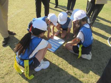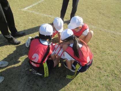 めあてを確認した後はチームタイムです。勝利を目指して課題を解決するために話し合ったり練習したりしました。作戦版を使って真剣に話し合う姿が印象的でした。