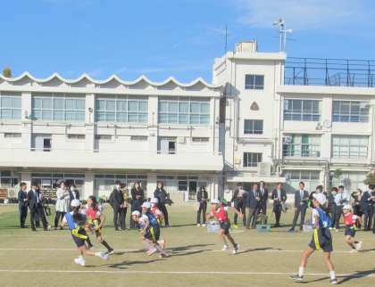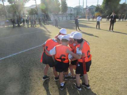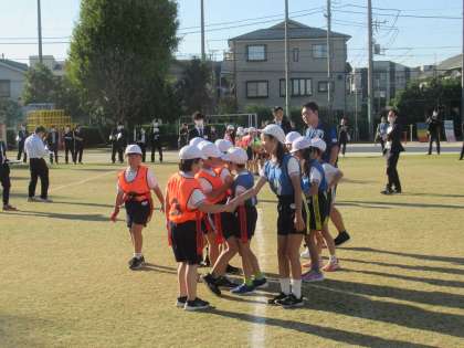 ゲームを始める時の「挨拶」「握手」「円陣を組んでかけ声」やゲーム終了時の「挨拶」「握手」をする子供たちの笑顔が印象的でした。ゲーム終了時に握手をしながらお互いを称え合う姿もたくさん見られました。相手をリスペクトする気持ちが分かる場面でした。