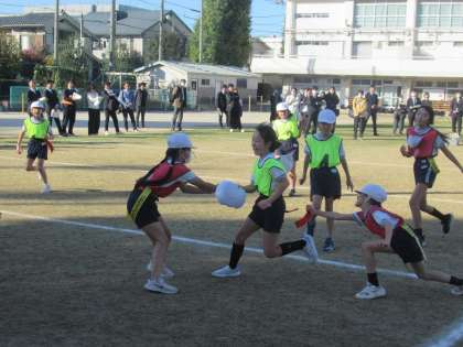 子供たちが使っているボールは、豊玉・開進地区の体育部員がこのゲームのために検討を重ねて作ったものです。そのボールを持って思い切り走ったり、パスをつないだりして、陣地を広げていく子供たちの姿は、本当に一生懸命で楽しそうでした。