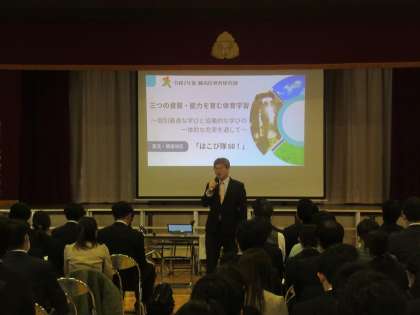 実証授業の後、体育館で研究協議会が行われました。体育研究部長や会場校校長の挨拶、顧問校長の紹介、豊玉・開進地区の提案、授業者自評と続きました。