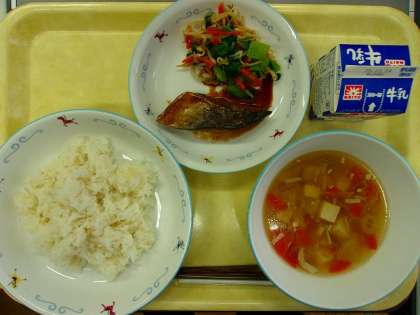 今日の給食 ・牛乳 ・麦ごはん ・さばのみそ煮 ・五目汁 ・おひたし 「さばのみそ煮」は、給食室の大きな釜で、さばをじっくり煮込んで作りました。煮込むときに使った材料は、みそ、しょうが、砂糖、みりん、酒、しょうゆです。しょうがには、魚のくさみを消してくれる働きがあります。 時間をかけて煮ることで、味がしみ込み、ふっくらと、おいしく仕上がります。今日はさばのおいしさを味わいましょう。 道徳(3年)