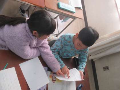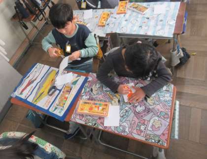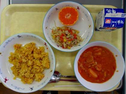 今日の給食 ・牛乳 ・カレーピラフ ・グヤーシュ ・野菜ソテー ・菊花みかん 「グヤーシュ」は、ハンガリーの代表的な煮込み料理で、パプリカの色と風味がとくちょうです。お肉と野菜がたっぷり入った、栄養のあるスープです。 この料理は、牛飼いが、寒い体をあたためるために、外で煮込み料理を作ったことが始まりといわれています。今日は、仕上げに生クリームとレモン汁を入れて風味をつけています。 図画工作(2年)