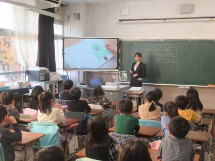 「おもてうら二つのせかいを考えて、せかいをぼうけんするマスコットをつくろう」というめあての学習です。表と裏が違う世界になっていて、マスコットが穴を通って行ったり来たりできる作品を作ります。 表と裏の世界をどのようにするかを考えた子供たちは、「季節(夏と冬)」「天気(晴れと雨)」「中と外」「現実と異世界」などと発表していました。素晴らしいです。題材が魅力的で、説明も分かりやすく、子供たちは楽しそうに学習していました。 練馬区教育委員会の教育アドバイザーの先生も授業を見ていただき、授業の質をより高められるようにご指導いただきました。