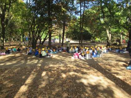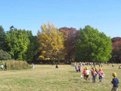 真っ青な空の下、1年生が秋を見付けに遠足に行きました。行先は光が丘公園です。学校から練馬駅へ元気に歩き、マナーを守って電車に乗り、光が丘駅に到着です。光が丘公園で子供たちは様々な「秋」を見付けていました。どんぐりや色づいた葉っぱもたくさん拾っていました。