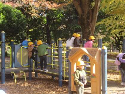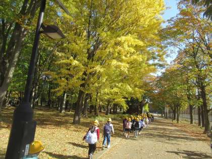 どんぐり拾いをした後、公園の中を通ってちびっ子広場へ向かいました。色づいた様々な木々がとても美しいです。