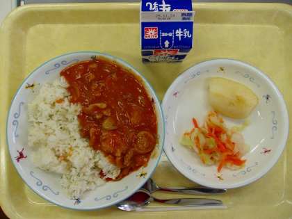 今日の給食 ・牛乳 ・バターライス ・ポークストロガノフ ・カントリーサラダ ・ラ・フランス 「ポークストロガノフ」は、「ビーフストロガノフ」を、豚肉を使ってアレンジした料理です。今日は、トマトソースをベースに、豚肉、たまねぎ、にんじん、マッシュルームを使って作りました。バターライスといっしょに食べてください。 果物は「ラ・フランス」という洋梨です。洋梨の中でも「ラ・フランス」は特に甘みが強いといわれています。そして、果肉がとろけるようにやわらかく、香りがよいことも、とくちょうです。 芋ほり(1年)